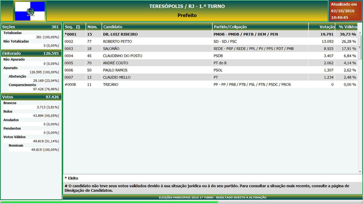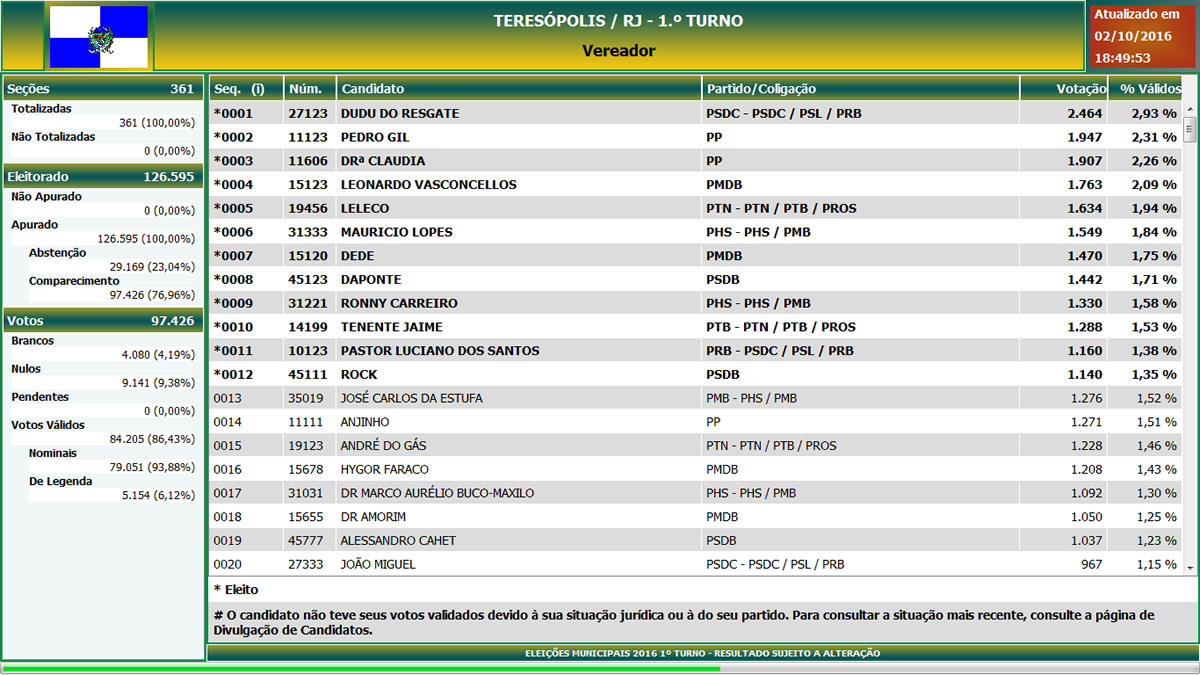 Acompanhe abaixo o resultado oficial das Eleições Municipais de 2016 em Teresópolis, para Prefeito e Vereadores: