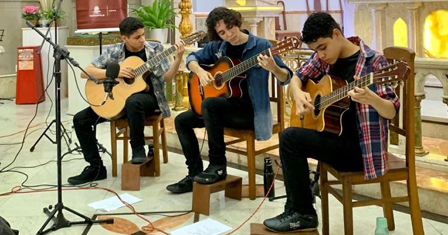 Teresópolis, 06/09/2023 - Na edição do último domingo, 03/09, do projeto Música na Matriz, o público aplaudiu a apresentação dos irmãos violonistas Matheus, Felipe e Miguel, do Trio Muniz, além da apresentação do Coral Municipal. Os artistas são todos talentos da Escola Municipal de Música Giordano Marrelli, Polo da Escola Villa-Lobos em Teresópolis. Músicas como ‘Ainda bem’ (Marisa Monte e Arnaldo Antunes), ‘Asa Branca’ (Luiz Gonzaga), ‘Aquarela’ (Toquinho e Vinicius de Moraes) e ‘Stairway to Heaven’ (Led Zepellin) ganharam versões próprias instrumentais dos três adolescentes, embalando e arrancando aplausos calorosos do público. “Agradecemos por nos apresentar pra tanta gente. Tudo o que sabemos, nós aprendemos na Escola de Música”, disse o jovem Matheus Muniz, ao final da performance. “Muito orgulho ver o trio de irmãos tão dedicado se apresentando no Música na Matriz, projeto da Secretaria de Cultura que em 2024 completará 30 anos trazendo boa música para a população”, enalteceu Rubens Tavares, diretor da Escola Municipal de Música, acompanhado do professor Geremias Cruz. Coral Municipal Em seguida, o canto do Coral Municipal de Teresópolis tomou conta da Matriz de Santa Teresa, com sucessos como ‘Caçador de Mim’ (Sérgio Magrão e Luiz Carlos Sá), ‘Trenzinho Caipira’ (Heitor Villa-Lobos) e ‘Berimbau’ (Baden Powell e Vinicius de Moraes), entre outros, sob a regência do professor Pablo Portilho, encerrando o concerto.
